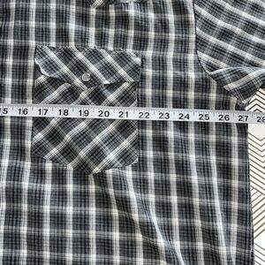 Excellent condition. This is a vintage Outlaw Western Wear men's shirt in plaid pattern and gray color. It has a collared neckline, long sleeves, and a button-down collar style with snap closure. The shirt is made of cotton blend flannel fabric and features a classic fit for big and tall men with a chest size of 54 inches. The shirt is adorned with button accents and a Chief Stencil Pearl Snap. It is a lightweight, easy-care, all-seasons shirt that is perfect for casual occasions.