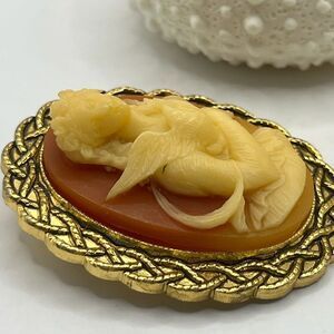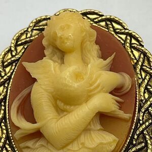 VTG Oval 3D Cameo Woman Holding a Dove Bird Gold Tone Brooch