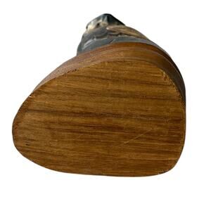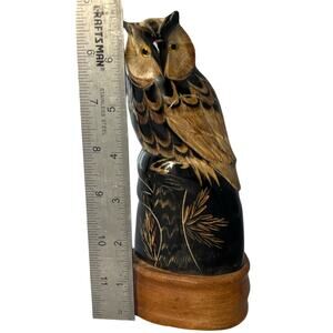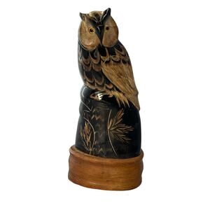 This product is a vintage owl figurine hand-carved from water buffalo horn, resting on a wooden base. Measuring 6 3/4 inches in height, this unique piece showcases intricate details and craftsmanship. The use of water buffalo horn adds a touch of exotic and natural beauty to the design, making it a charming and distinctive addition to any decor.