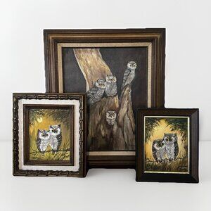 VTG Owl Original Oil Paintings on Canvas 1970’s Framed Signed Gold Set of 3