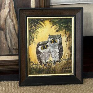 This is a set of original oil paintings by Edna L. Jones in Jacksonville, Florida USA from the 1970’s. They features owls sitting in trees in the moonlight in beautiful gold and brown tones. They are signed by the artist with her card stapled to the back of 2 of the pieces. The double frame and burlap-like matting perfectly showcase these beautiful pieces.