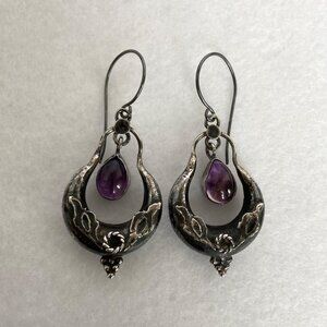 Vintage Oxidized Sterling Silver 925 Teardrop Amethyst Cabochon Dangle Drop Earrings