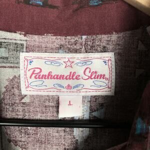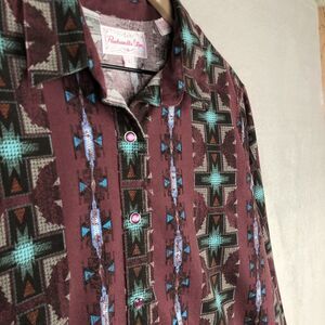 This vintage Panhandle Slim women's shirt in size Large features a Southwest/Aztec design, long sleeves with pink pearl snaps, a collared neckline, and is made of 100% cotton. The shirt is machine washable and has a regular fit. With a Western theme, the stylish shirt is perfect for travel or casual wear. Designed in Texas and made in Indonesia.
