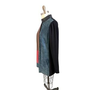 Vintage PER SE Long Black Sweater with Brown and Red Leather and teal Blue Suede colorblocks. Black Leather Crew Neck Collar. Button Down. Ladies Size 16. In excellent condition but there are small light marks on the suede..