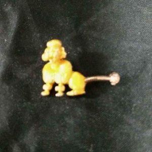 THIS SMALL BUT UNIQUE VINTAGE POODLE BROOCH IS PAINTED IN A YELLOW ENAMEL AND THE POODLE HAS CLEAR RHINESTONE EYES AND ITS UNIQUE FEATURE IS THAT THE TAIL IS MADE FROM A SNAKE LIKE CHAIN SO IT IS MOVABLE.. FOR A SMALL BROOCH IT WILL GET YOU MANY COMPLIMENTS AND IS IN VERY GOOD CONDITION IT DOES HAVE SOME WEAR ON THE ENAMEL BUT NOT MUCH SEE PICTURES TO SEE CONDITION IT IS VERY CUTE AND ELEGANT... IT IS DIFFERENT FROM ANY OF THE OTHER POODLE BROOCHES I HAVE SEEN..