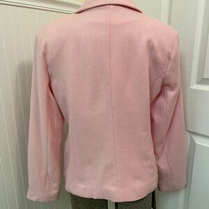 100% PURE WOOL VINTAGE PINK JACKET WITH FULL ZIPPER FRONT. SIZE 12, LONG SLEEVED. JACKET IS FULLY LINED IN 100% ACETATE LINING. SHORT JACKET 24 5/8 LONG FROM SHOULDER SEAM TO BOTTOM OF HEM. FRONT LINED POCKETS THAT HAVE NEVER BEEN OPENED. CONDITION IS 9/10.