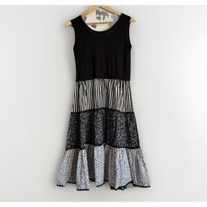 VTG PKs Closet Patchwork Fit & Flare Tiered Dress Sz 12 Black White Artsy Boho