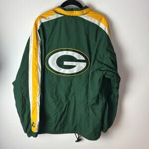 Gently Used Vintage NFL Green Bay Packers Starter Jacket. This is a men's large. Mostly Packers green with yellow and white stripes /accents on the sleeves and collar. Full zip with a metal Starter logo for the zipper. Front pockets. Green Bay G logo on the sleeve. Made in Hong Kong. Should be waterproof as it is 100% nylon with polyurethane coating. In amazing condition given its age!