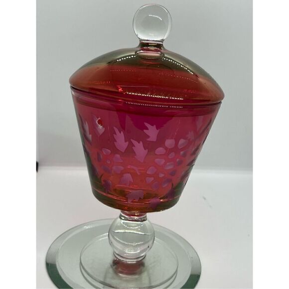 This vintage glass candy dish is a beautiful addition to any collection. With a stunning ruby red color and cranberry glass production style, it is sure to catch the eye. The dish is made of high-quality glass material and has a vintage original model design.