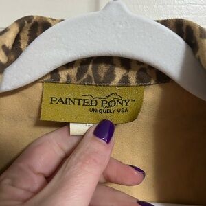 This vintage Painted Pony jacket is a must-have for any fashionable woman. The leopard print pattern and button-down collar style make it a unique piece that will stand out in any wardrobe. The jacket is made of a polyester blend and features a short length, long sleeves, and pockets for added convenience. It is recommended to dry clean only to maintain the jacket's beauty. The multicolor design is perfect for any casual occasion and can be worn in any season. This jacket is a regular size large and is perfect for those who love animal prints and designer styles. Made in the United States, this jacket is sure to make a statement wherever you go. It is pre-owned, but in excellent condition!