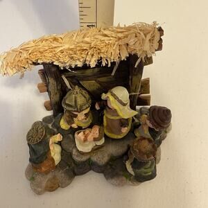 VTG Painted Resin Nativity Figurine Jesus Mary Joseph Wise Men in Stable 6”x 4”