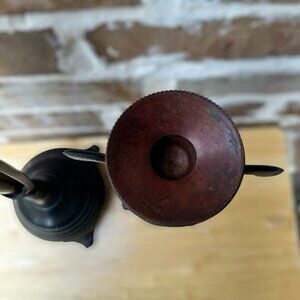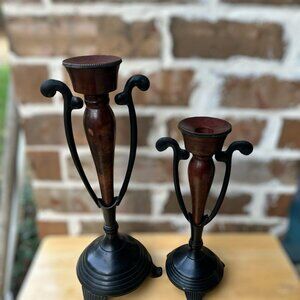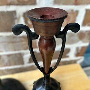 Add a touch of mid-century modern charm to your home decor with this set of two vintage painted yellow brass metal candle holders. These candle holders feature a tripod footed design and measure 15 inches and 11.5 inches respectively. The multicolor finish and handmade design make them a unique addition to any interior subject. Perfect for all occasions, these original candle holders are made in India and are not antique. The MCM style and originality make them a great decorative collectible. Whether you're looking to add a pop of color or create a cozy atmosphere, these candle holders are the perfect choice. These candle sticks can be disassembled as needed and are made of solid yellow brass. The brownish red color is well done and resembles mahogany or teak wood. Pre owned in good condition, minor use wear over the years. These MCM candle holders are in good pre owned clean condition with minor use handling wear, no issues.