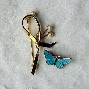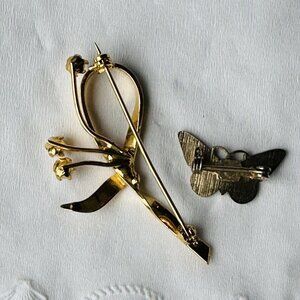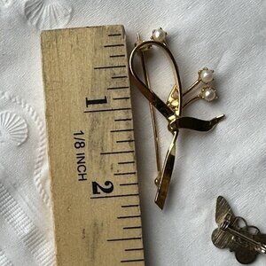 VTG Pair Ribbon Brooch Gold Tone Ivory Faux Pearl Butterfly Pin Fashion Jewelry