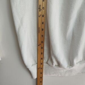 The Vintage Pannill Disney Mickey Mouse Pullover Sweatshirt is a vintage women's XL white sweatshirt featuring a graphic print of Mickey Mouse. It has long sleeves, a crew neck, and a pullover closure. Made from a blend of polyester and cotton, this knit sweatshirt is machine washable and has a regular fit. Perfect for activewear, this Disney-themed sweatshirt with a bow accent is a stylish addition to any cartoon lover's wardrobe. Made in the United States by Pannill, it embodies the nostalgia and charm of classic Disney characters.