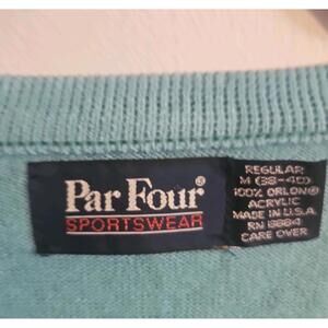 The VTG Par Four Sportswear Golf Sweater in light aqua blue medium is a classic men's pullover sweater with a V-neck design and raglan sleeves. Made from acrylic knit material, this sweater is lightweight and perfect for golfing activities or casual wear. The vintage look and solid pattern give it a timeless and relaxed style, while the tight-knit fabric adds durability. Perfect for any golfer looking for a comfortable and stylish sweater to wear on the course or out.