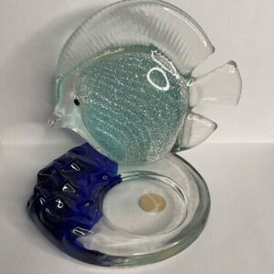 VTG PartyLite Art Glass Sparkly Blue Tropical Fish Tea Light Candle Holder 4" T