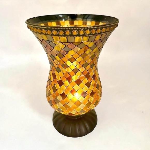 This retired piece was part of PartyLite's Global Fusion collection from the mid-2000s, which featured internationally-inspired designs with mosaic glass and metal bases.