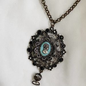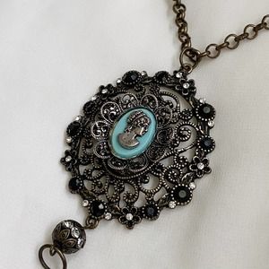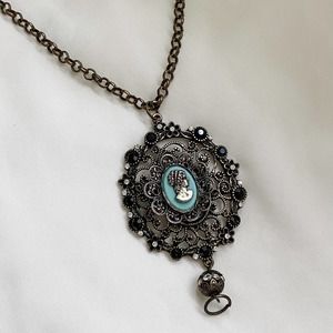Features an all over brassy toned metal, chunky oval victorian detailed medallion with flower and black jewel details, and oval center with. a pastel blue teal blue background and silver cameo silhouette.