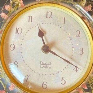 This Vintage Lucite Pastoral Dwelling Wall Clock is a charming addition to any decor, featuring a unique design adorned with dried flowers that evoke a sense of nostalgia. Measuring 8 inches in diameter, with a clock face of 5 inches, this acrylic resin piece not only serves as a functional timepiece but also as a decorative art object. Its ability to glow under blacklight adds an intriguing element, making it a standout feature in dimly lit spaces. The clock is in great vintage condition, free from chips or cracks, ensuring its longevity and aesthetic appeal.