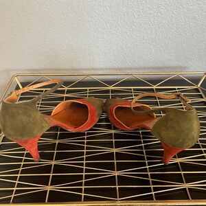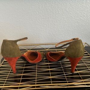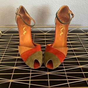 VTG Patchwork Suede Peep Toe Heel Sandals Spain 70s Vibes Green Orange Nina 9N
