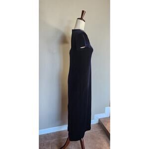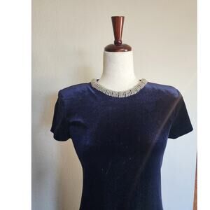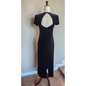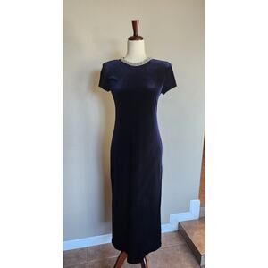 Vintage Patra Dark Blue Stretch Velvet Full Length Evening Gown. Rhinestones to neckline. Cutout Back. Button Closure. In great preowned condition. Slit to back. Smoke Free Home.