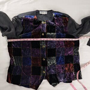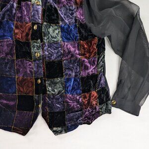 VTG Patterned Checkered Velvet Button Up Black Sheer Long Sleeve Whimsy Jacket