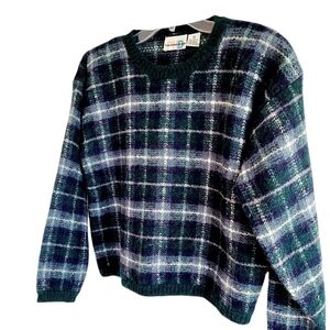 VTG Paul Harris Design Mohair blend Sweater Medium Plaid Navy Green Crewneck EUC