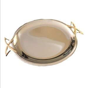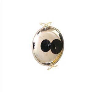 Mid Century Pedestal Cake Plate Stainless Steel Black Glass Pedestal 15” with decorative handles. Plate is 13”. Gold Decorative handles. Pic of the pedestal looks like there is a crack/however it is just the lighting. VGC. Some light flaking of the handles.