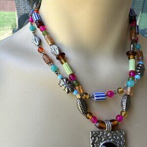 VTG Pendant Necklace 17" Beaded Art Glass Multicolor Double Strand Adjustable