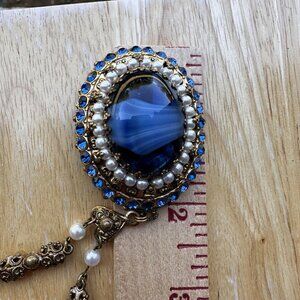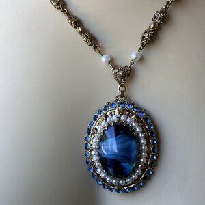 Add a touch of vintage elegance to your outfit with this stunning necklace from West Germany with 26" length gold tone chain. The gorgeous oval-shaped pendant features a beautiful combination of blue glass, faux pearls, and rhinestones that sparkle in the light. The necklace is made of gold plated metal and has a prong setting style that adds a unique touch to the overall design. This 26" signed West Germany pendant necklace is gold plated metal with a royal blue art glass cabochon flanked with faux pearls and deep blue crystal rhinestones that are bezel set creating a domed tiered appearance with depth like looking into a pool of deep water. This is a vintage completely hand crafted jewelry art work in good to excellent pre owned clean condition with some use wear on the gold plated metal, all original stone or glass elements. Please review the pictures for more details and size measurement information, investment collector quality, thank you.