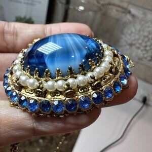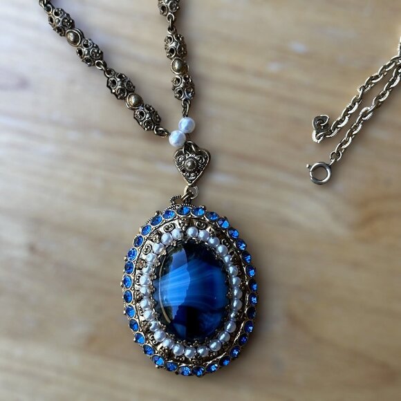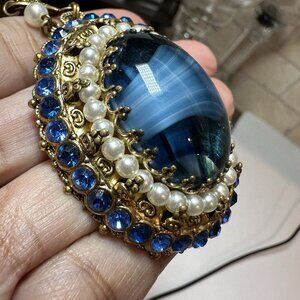 Add a touch of vintage elegance to your outfit with this stunning necklace from West Germany with 26" length gold tone chain. The gorgeous oval-shaped pendant features a beautiful combination of blue glass, faux pearls, and rhinestones that sparkle in the light. The necklace is made of gold plated metal and has a prong setting style that adds a unique touch to the overall design. This 26" signed West Germany pendant necklace is gold plated metal with a royal blue art glass cabochon flanked with faux pearls and deep blue crystal rhinestones that are bezel set creating a domed tiered appearance with depth like looking into a pool of deep water. This is a vintage completely hand crafted jewelry art work in good to excellent pre owned clean condition with some use wear on the gold plated metal, all original stone or glass elements. Please review the pictures for more details and size measurement information, investment collector quality, thank you.