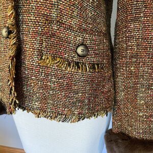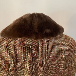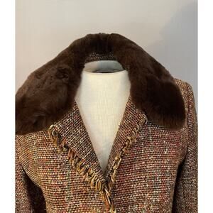 Step back in time with this vintage Bloomingdale's jacket from the 70s. Made from 75% silk, this short length blazer features long sleeves with a button closure, perfect for any occasion from formal to business. The multicolor jacket is accented with rabbit fur trim and fringe detailing, adding a touch of glamour to the classic fit.
