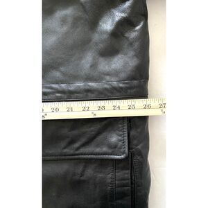 Embrace timeless style with this 90's vintage Perry Ellis jacket. Featuring an oversized black design, heavy leather material, and bold snap buttons, this jacket offers a classic, statement look. With functional pockets, a zipper and snap closure, and an interior drawstring waist, it adds both style and comfort to any outfit.