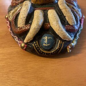 Very nice mask. Hand painted with lots of great colorful detail. Exaggerated features and Tusk like teeth. Measurement mask. Top to bottom measures approximately 7.25 inches. At why does this measures approximately 6.25 inches. I believe this is a heavily laced papier-mâché. No issues no chips or drops/dings.