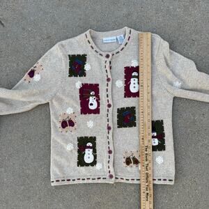 VTG Petite Rustic Cabincore Snowman Patchwork Christmas Cardigan Sweater