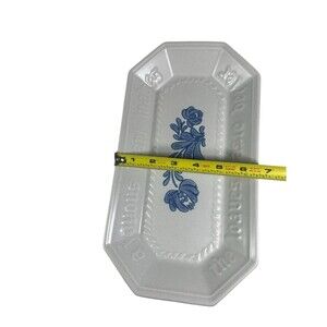 The VTG Pfaltzgraff Platter Bread Loaf Serving Plate is a vintage stoneware dish with a charming Joyous Heart design in a blue color flower pattern. Made in America by Pfaltzgraff, this oval bread plate features a Yorktown theme and measures 12 1/4" in length and 6.5" in width.