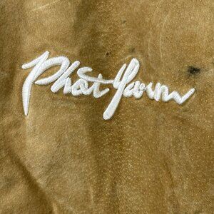 The VTG Phat Farm Coat is a stylish and brash men's jacket in size 5XL, featuring a brown suede outer shell with faux fur lining for added warmth. This mid-length coat has a zip and button closure, making it perfect for casual winter occasions. The design incorporates elements of hip hop style with embroidered accents and a spread collar, giving it a unique and vintage look. The softshell fabric and synthetic insulation ensure comfort and durability, while the regular fit makes it comfortable for everyday wear. Perfect for walking or hiking in cold weather, this coat is a bold statement piece for any fashion-forward man.