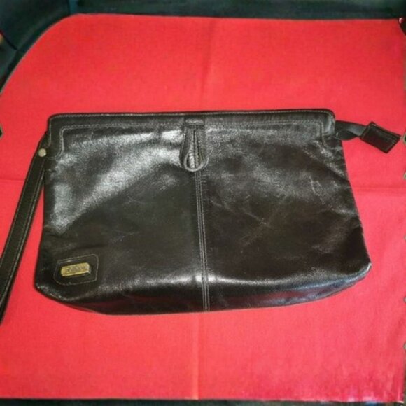 This vintage Phillippe black leather clutch measures 10 inches in width and features a zip closure. The small-sized clutch has a black fabric lining with inner pockets and a black leather handle/strap. The exterior of the clutch is adorned with a logo accent, giving it a classic and elegant look. The hardware and handle/strap color are both black, complementing the exterior color of the clutch. This timeless piece is perfect for women looking for a sophisticated and versatile accessory to add to their collection.