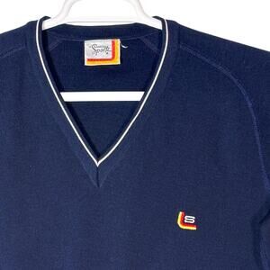 Men's V-Neck Knit Retro Sport Ivy League Prep School Sweater from Pierre Sangan Sportz in Navy Blue. Size Large (42)