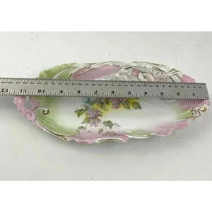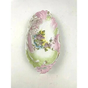 VTG Pink Green Porcelain Celery Dish Cut Out Handles Gold Accent Estate Find