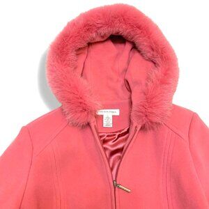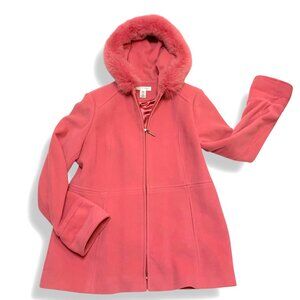 VTG Pink Wool Coat Fox Fur Hood Zip Lined Sz L Barbiecore Bubblegum Holidays