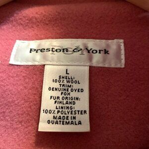 This vintage Preston and York coat features a vibrant pink wool fabric with a luxurious fox fur hood. The midi-length design and full lining offer both style and warmth, perfect for any Barbiecore enthusiast.
