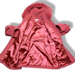 vintage coat, pink wool coat, fox fur hood, Barbiecore fashion, Preston York, lined coat, midi coat, winter fashion, size large coat, stylish outerwear, fox fur fashion, women's coat, vintage fashion