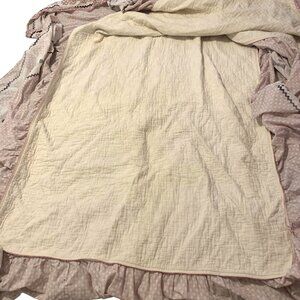 This twin bed quilt features a charming cat-themed design with pink and white hues. Its soft material ensures comfort. Despite visible wear, it remains functional and carries a vintage charm for collectors or use. Made in the USA.