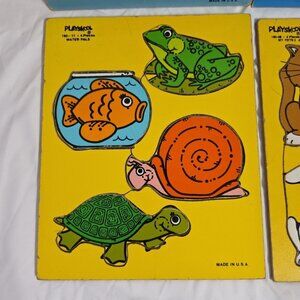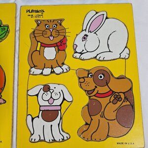VTG Playskool Wooden Puzzles Lot Of 4 Pets Water Pals Fruit Veg Made in the USA 11.5 in x 9.5 in