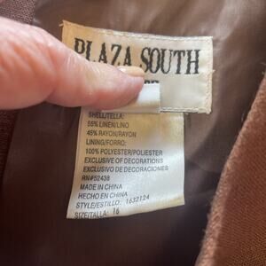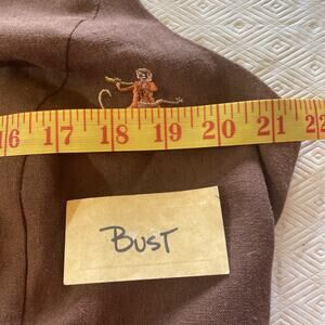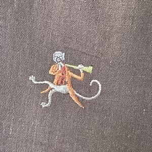 This vintage cropped blouse from Plaza South is the kind of piece you only find once—in a thrift aisle, at a yard sale, or in your cool aunt’s closet. Chocolate brown with a silky full lining, tailored darts, and—wait for it—tiny embroidered monkeys dancing across the fabric. Like, joyfully. With instruments.