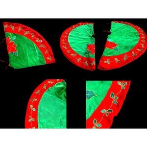 VTG Poinsettia Christmas Tree Skirt Red Green Holly Embroidered Flower L…