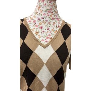 Authentic Polo Jeans Co. by Ralph Lauren, no longer in production and highly collectible. Made in Hong Kong, this vintage sweater is a 90s/Y2K preppy classic. Features a V-neck, short sleeves, and a tan/brown/cream argyle knit pattern. Material is 60% cotton and 40% rayon, soft and breathable. Size Large. In good vintage condition. Perfect for layering, streetwear looks, or a preppy retro vibe.