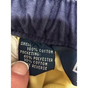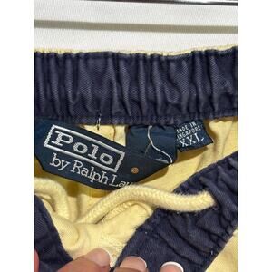 The product is a pair of men's vintage Polo Ralph Lauren Baggies shorts in size XXL, featuring a solid yellow color and a zip closure. Made of cotton with a stretch waist, these shorts are designed for casual occasions and have a regular fit. The shorts also have a 5-inch inseam and are accented with the iconic Polo Ralph Lauren logo, adding a touch of style to the classic chino style. Perfect for comfortable and fashionable summertime wear.