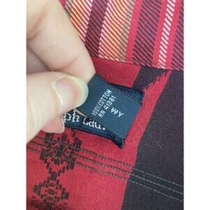 This vintage Polo Ralph Lauren shirt for men in size XXL features a unique Aztec Southwestern design with a chin strap detail, making it stand out for various occasions such as parties, casual wear, or workwear. The shirt is made of cotton with a woven fabric type and a geometric pattern in red and blue colors. With a collared neckline, long sleeves, and button closure, this shirt offers a regular fit and easy care through machine washing. The Western theme and designer accents make it a stylish addition to any wardrobe, perfect for the 90s or cowboy-inspired look. *Please note there is a couple small thread picks as seen in pictures. Item is from a pet friendly home so may have to rogue pet hairs!*